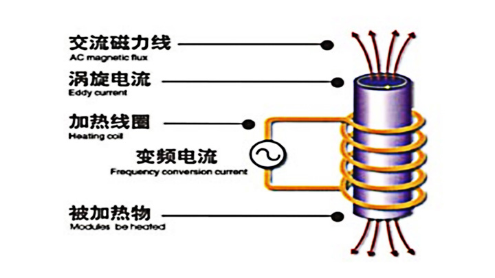 Тиристорный преобразователь частоты (SCR) формирует переменный ток заданной частоты; спиральный индуктор создаёт переменное магнитное поле; в заготовке возникают вихревые токи, нагревающие металл объёмно до уставки.